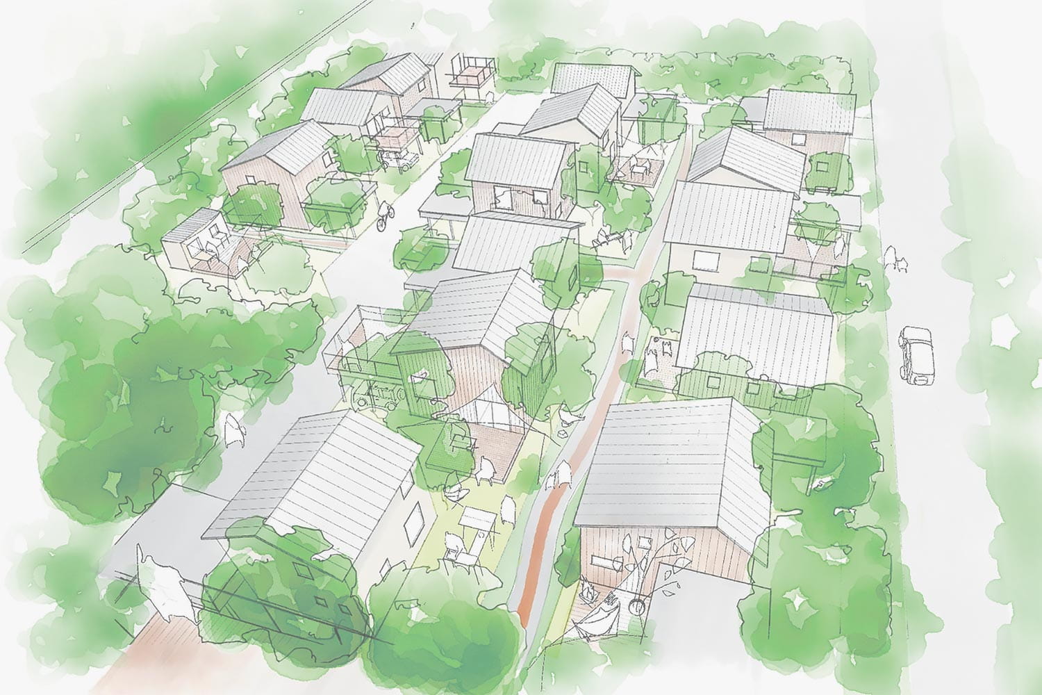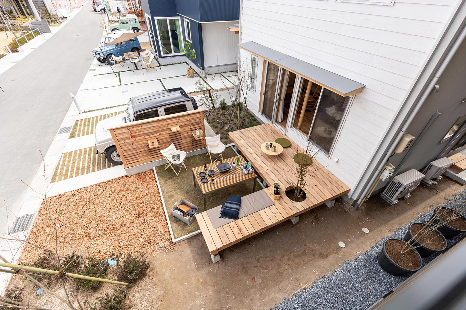 アウトドアリビングと高性能エコハウスが集積した、新しい街づくり山形エコタウン前明石。東北芸術工科大学、㈱荒正、㈱スノーピークが三社共同企画をし、「野遊び(アウトドア)を楽しむ」ライフスタイルを提案しながら、HEAT20のG2レベルを上回る高性能エコハウスで街並みを形成。街区全体を庭のように一体化する緑道や共有スペース、植栽を配し良質なコミュニティが自然にはぐくまれる仕掛けを施しています。