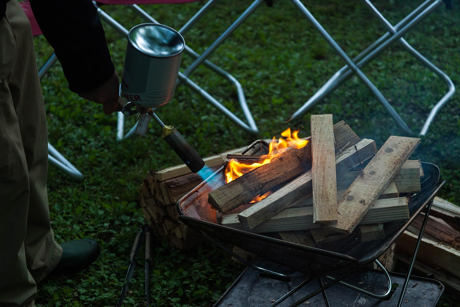 ふだんは直営店として営業しているスノーピーク昭島アウトドアヴィレッジで、夕暮れの時間とともに「焚火トーク」を行います。
