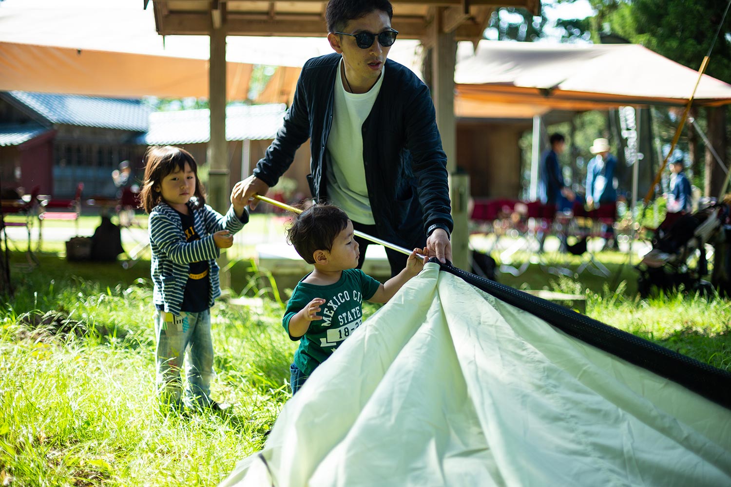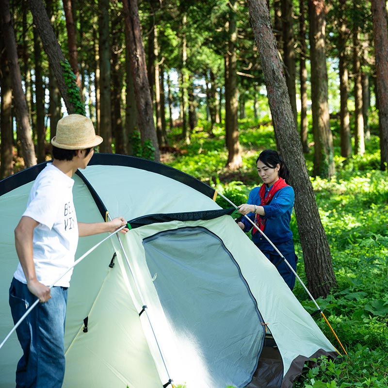 スタッフレクチャーのもと、お客様にはお泊り頂くテントの設営体験をして頂きます。テント設営が初めての方でも、安心してご参加頂けます。