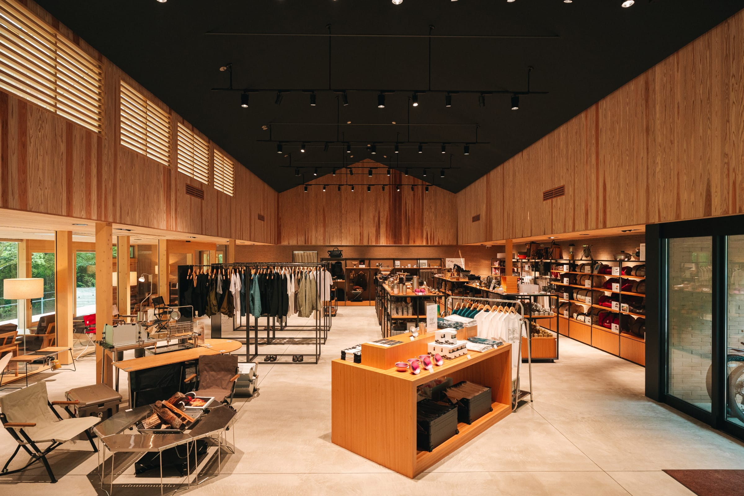 宮崎/鹿児島エリア初の直営店。スノーピークのキャンプ用品、アパレルに加えて、ここでしか買えない限定品や、地元の名産品など都城の特色溢れる商品を多数取り揃えます。また景観を眺めることに特化した広縁や、都城の自然を感じられる内装にもご注目ください。