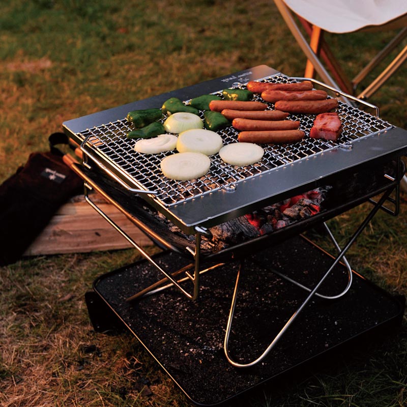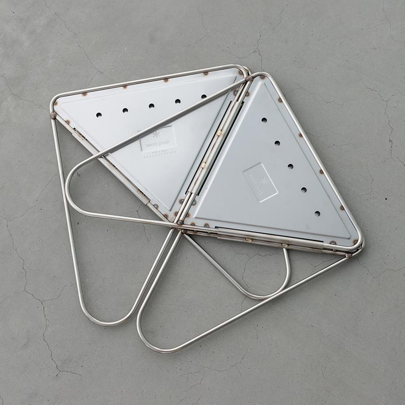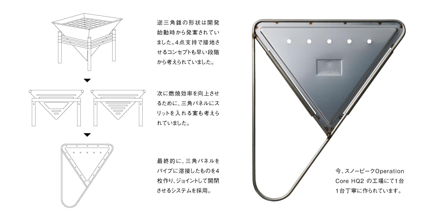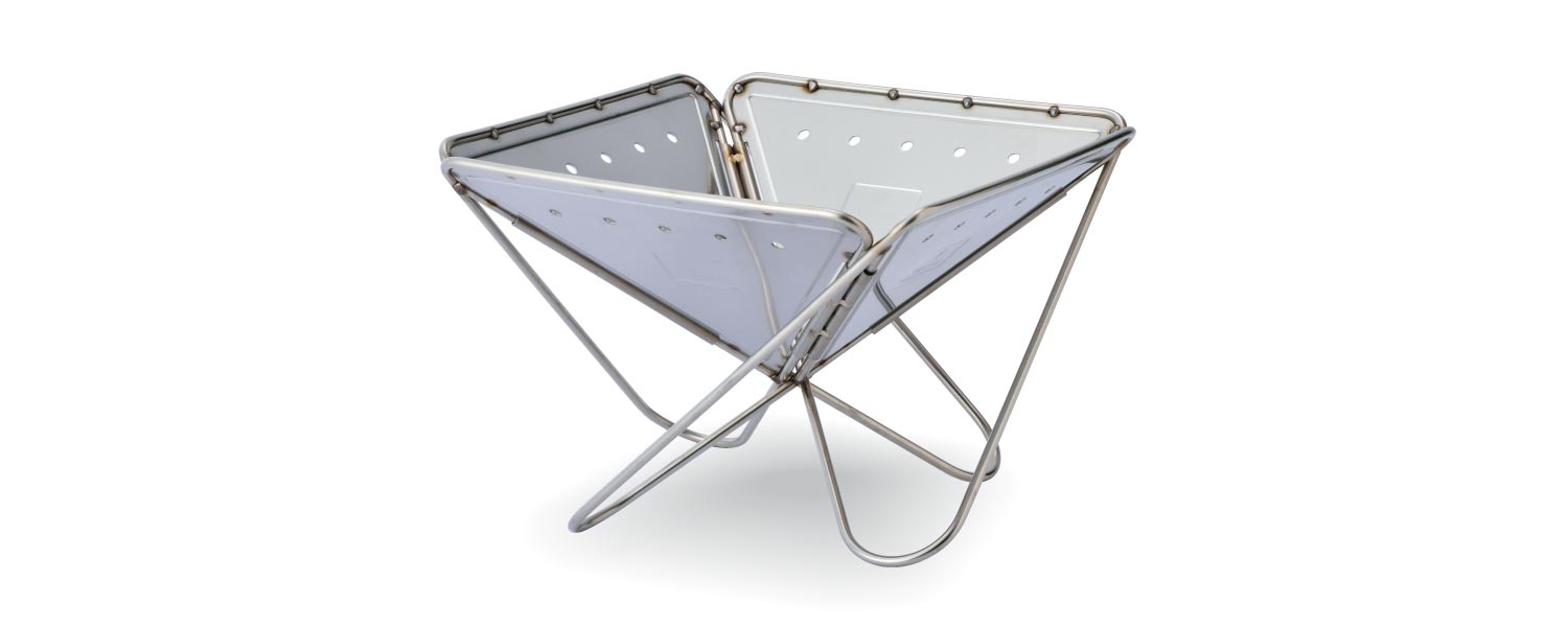 開発がスタートして早い段階で、逆四角錐のスタイルが構想にあがった。火が燃えるスペースは外へ向かって開いている形状がベストであること、さらに収納を考え折り畳めて持ち運びができること。必要な要素を全て考察した結果だ。最終的にできあがったのは、脚部を兼ねた三角のステンレスパネルをパイプで囲み、同じ形状のものを4枚つなげる非常にシンプルな構造。薄く閉じて、使用時には開いて地面に置くだけの簡単なセッティングが可能となった。開発も終盤にさしかかった頃に、耐久性を試す検証を何度も繰り返し、1.5mm厚のステンレス材を採用した。実は、最後の検証の場に持ち込まれたサンプルは現行モデルよりも薄い板厚が用いられていた。しかし、本体の周りにも薪を重ね、まるでキャンプファイヤーのような中での過酷な耐熱実験を行ったところ、約1時間後、サンプルを取り出してみるとステンレス板は波打ち、予想以上の変形が確認できたのだ。板厚をこれ以上あげれば重くなってしまう。しかし開発者が迷うことはなかった。焚火や炭火の高温に耐え、一生使い続けることができる過剰なまでに頑強なスペックを求めていたからだ。