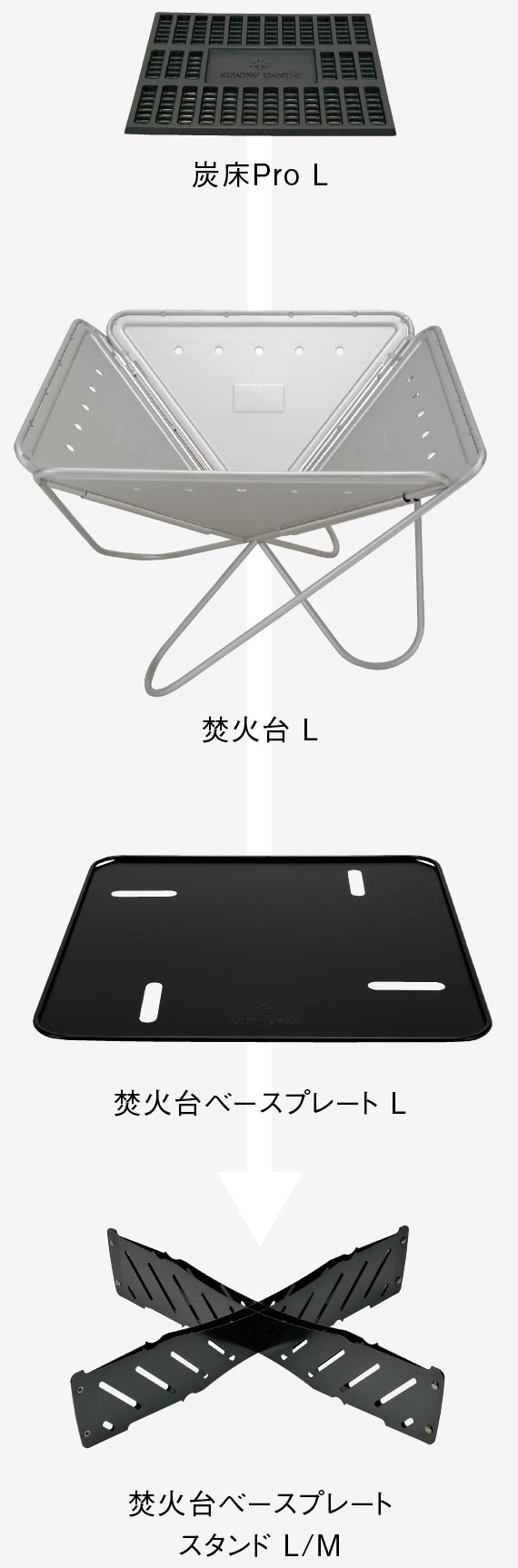 ちょっと肌寒さを感じる夕暮れ時。仲間とともにパチパチと木が爆ぜる音に耳を傾けながら、ゆらゆらと揺らめく炎を見つめ、時々薪をくべる。手をかざして温もりを確かめたり、目にしみる煙から顔をそむけたり・・・。でも、誰ひとり、その場所から動こうとはしない。言葉のいらない時間。それはとても愛おしい時間。スノーピークの代表的な商品のひとつ、焚火台。4枚のパネルをつなげた逆四角錐のシンプルな構造と、高い熱量に耐えるタフなスペックで、1996年のデビュー以来、愛され続ける定番商品だ。組み立ての手間がいらないシンプルな開閉システム。材質は、強靭なスペックで炎に耐える厚さ1.5mmの頑強なステンレス材。サイズはS・M・Lの3種類。人数やスタイル、アクティビティに応じて選ぶことができる。使い込むほどに風合いが増し、使い手とともに思い出を刻みながら育ってくれる一生の相棒にふさわしいギアだ。
