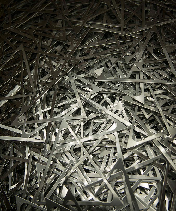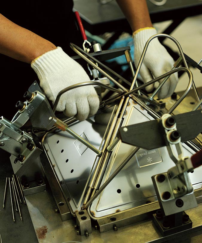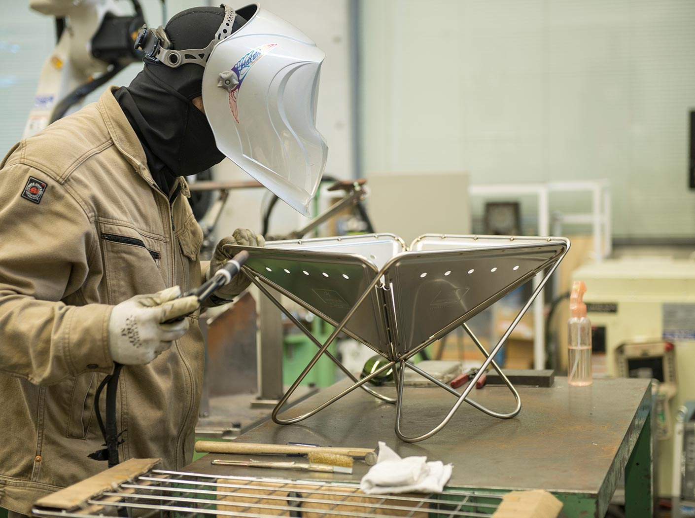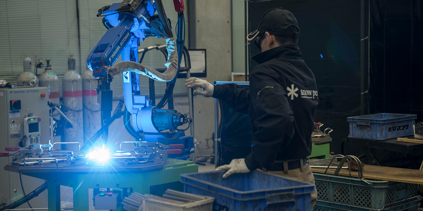現在、焚火台を手がけているのは、スノーピークの本社工場。これまでの社外の工場との分業を見直し、2011年の工場移転を機に溶接ロボットを導入。一連の工程を内製化した。焚火台の三角パネル部分の溶接にはこれまでもロボットを使っていたが、4面を組み合わせることに使うのは初の試み。ロット、気温、湿度によって微妙に変化する部材のバラツキや習性を考慮した1mm以下の微調整、材質の異なるステンレス同士の溶接など、試行錯誤を繰り返した。「正確な動きをするロボットだからこそ、日々微妙に変化するものをつなぐための融通が利かないという逆のデメリットも乗り越えなくてはいけない壁でした」と、工場長は語る。あらゆる作業を多面的に捉え、工程を精査し、ひとつひとつ問題をクリアし、ロボットによる一連の溶接工程を確立した。たとえば、パネル1枚・16箇所の溶接に対し、ロボットに入力するデータは200項目にも及ぶ。もちろん部材の変化の都度、プログラミングを変更。繊細な調整も含め、工程を確立させたことはチームの結束も深めた。2013年にはロボットを増設し更なる増産に挑んだ。現在も一台一台、心を込めて生産を行っている。その証として記されているのが「HEADQUARTERS」の刻印だ。