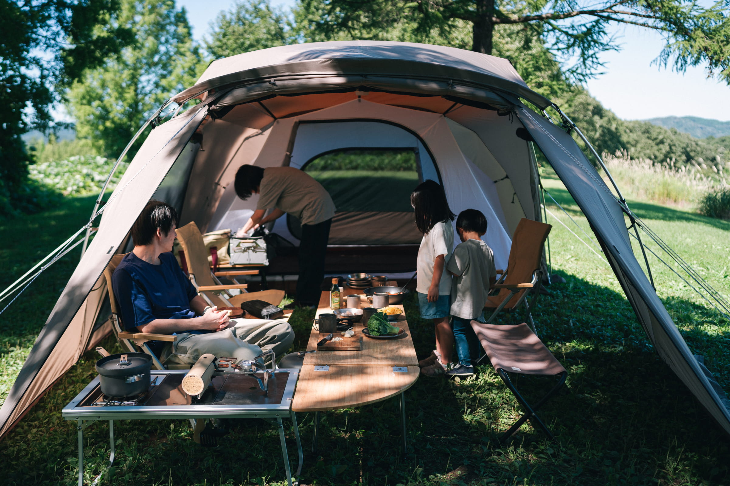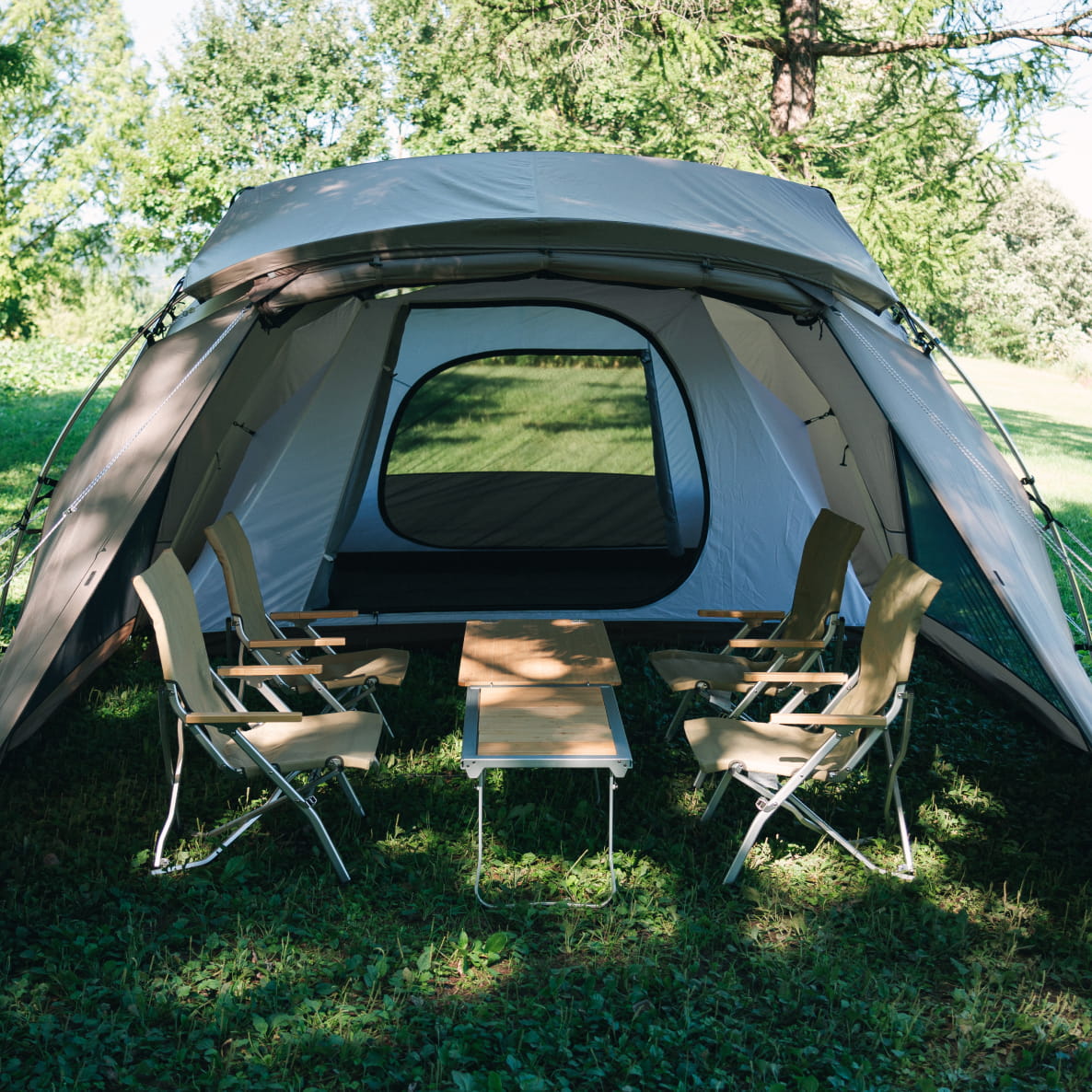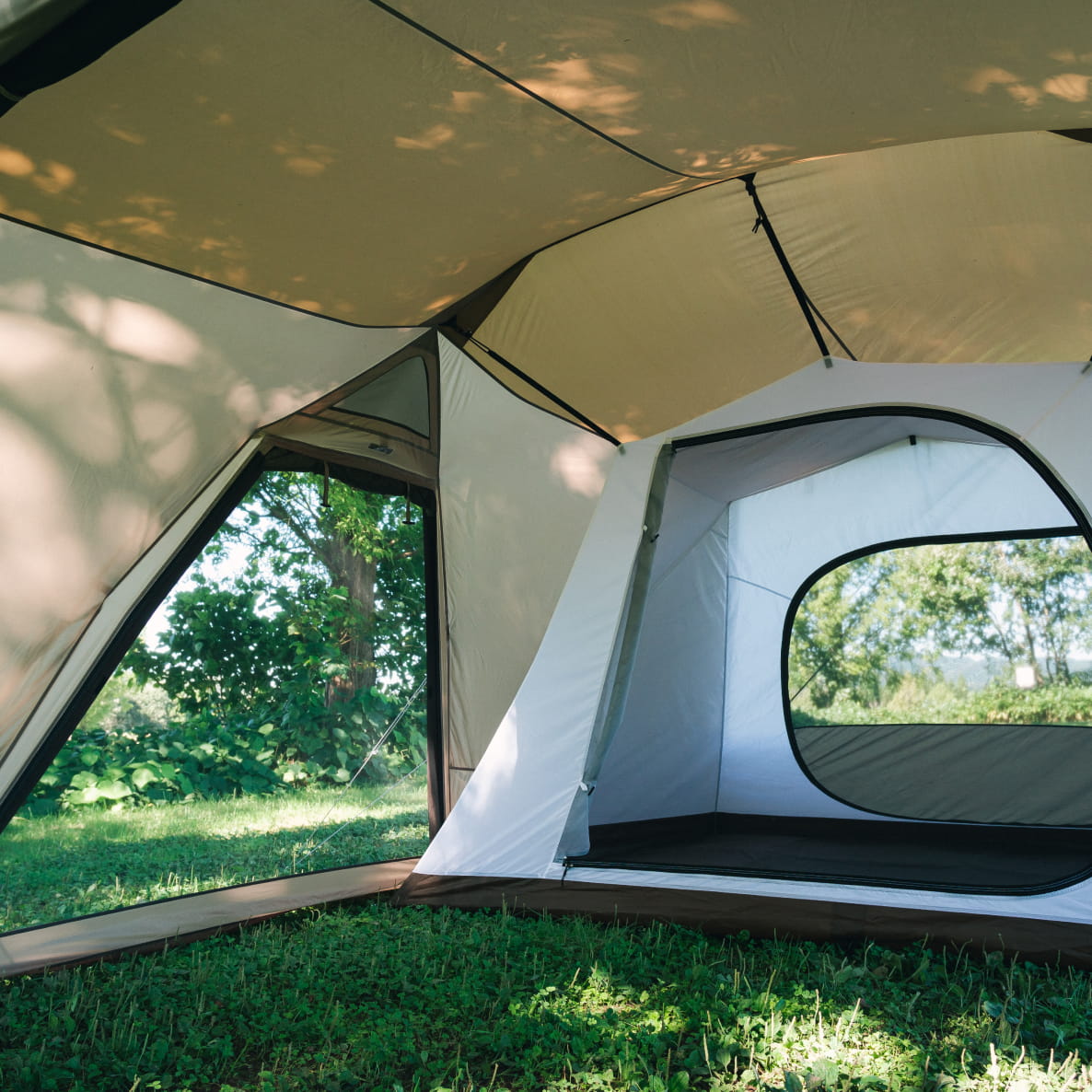 キャンプ初心者にも最適な「ランドネストシェルター」は、簡単な設営と快適な居住性を両立させた、家族4人で広々と使える2ルームシェルターです。リビングと寝室が一体となっている2ルームシェルターは設営が一度で済むうえ、寝室である吊り下げ式のインナールームを外せば大型シェルターとしても活用できます。
