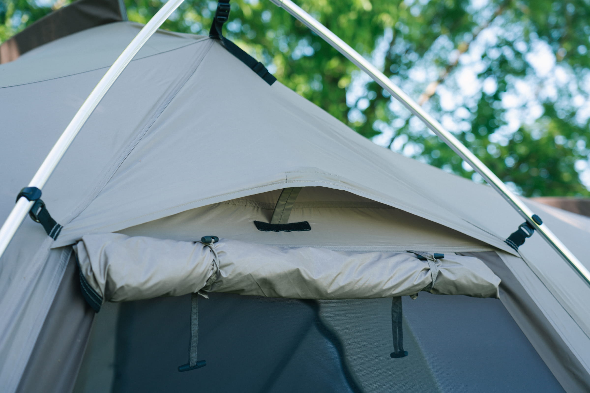 天井部に施した遮光ピグメント加工が夏の強い日差しを遮り、4箇所の大きなメッシュパネルが通気性を高めます。冬場の冷気の侵入を防ぐスカートも備えており、季節を問わず快適な空間を提供します。