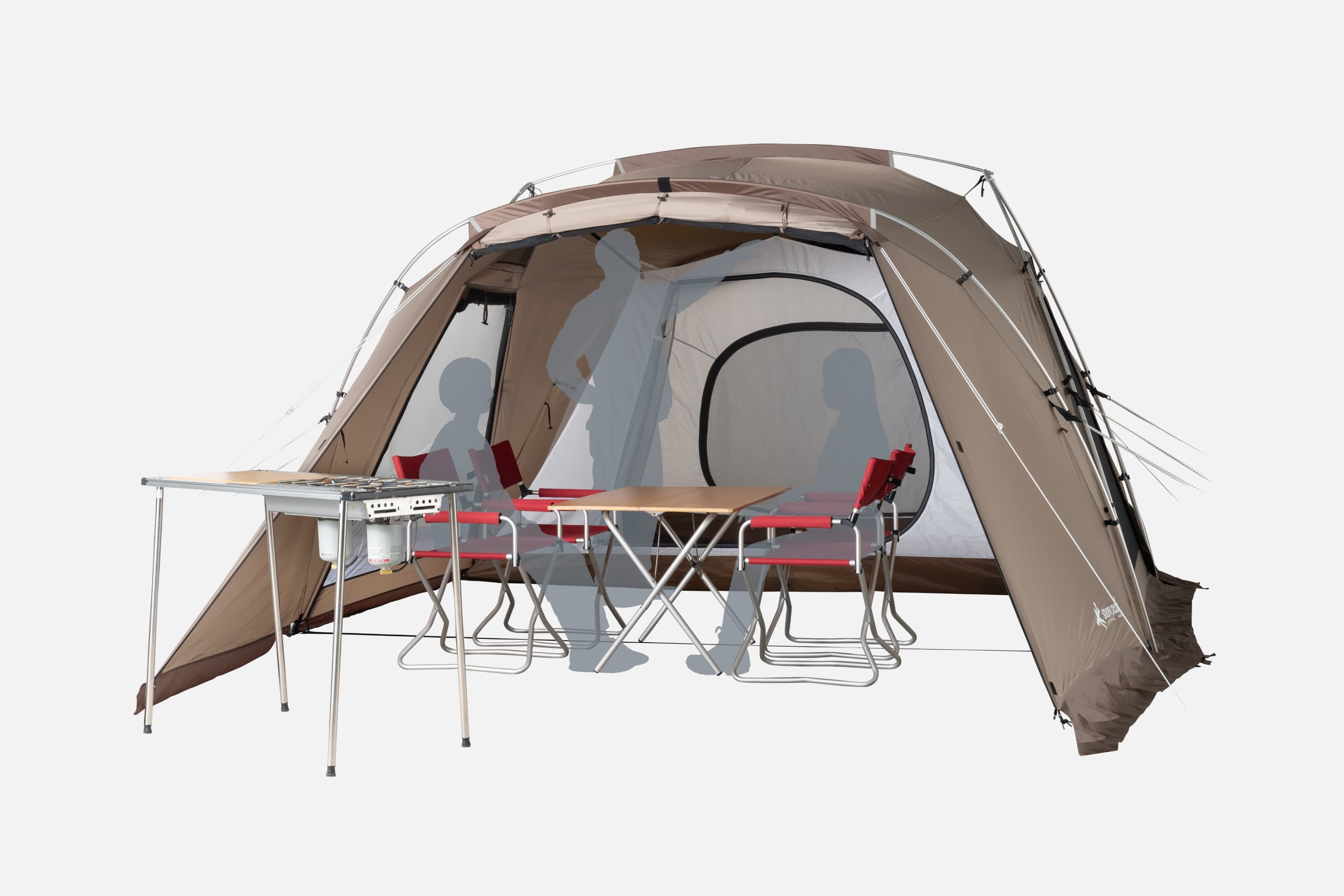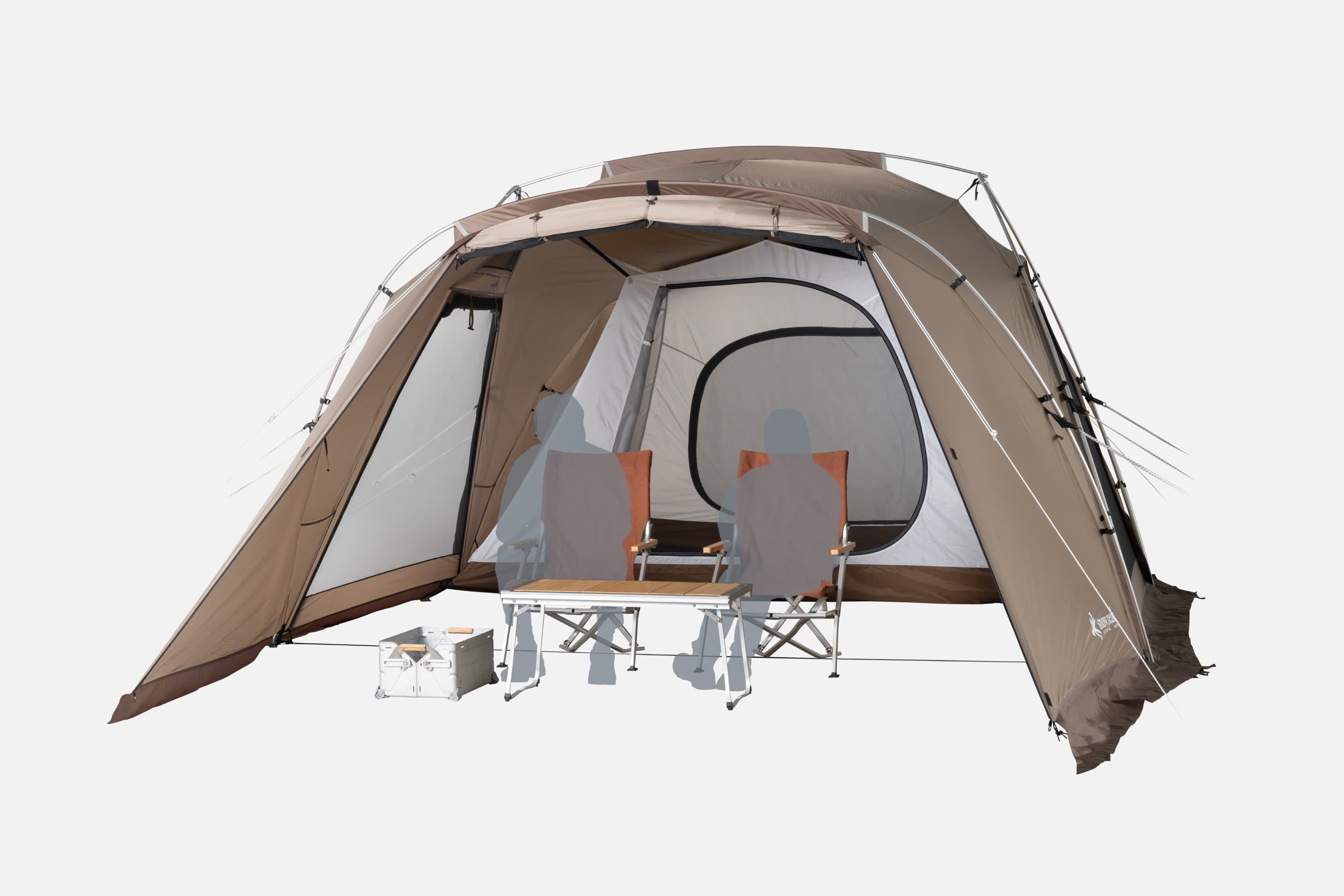 リビングと寝室が一体化した2ルームシェルターは、一度の設営で完了。家族4人で快適に過ごせます。付属の吊り下げ式インナールームを外せば大型シェルターとしても活用できます。