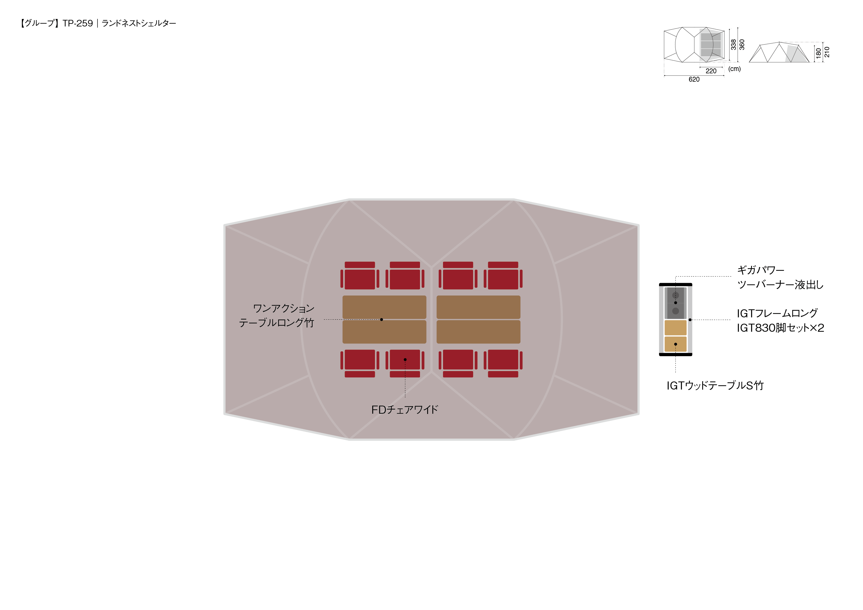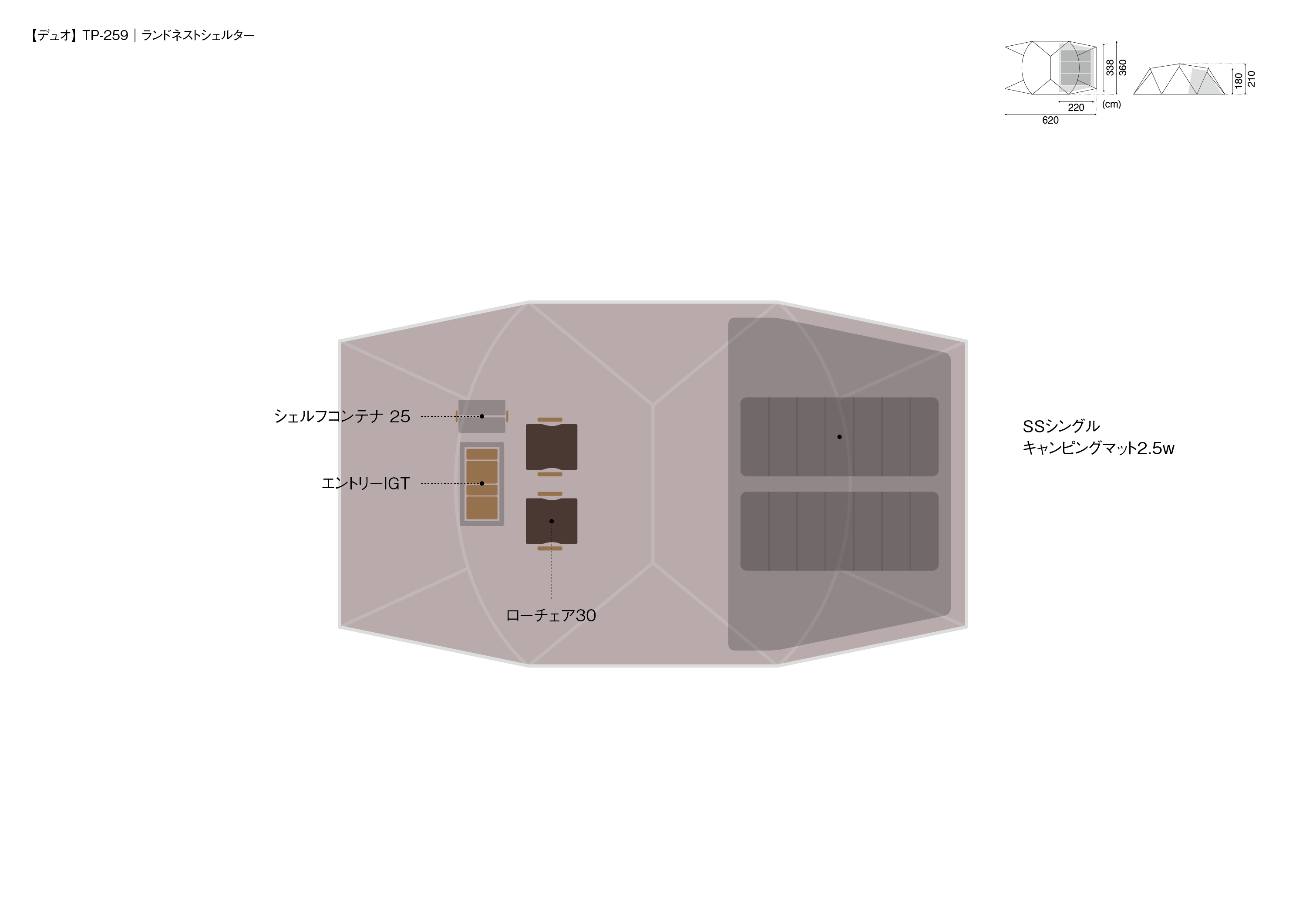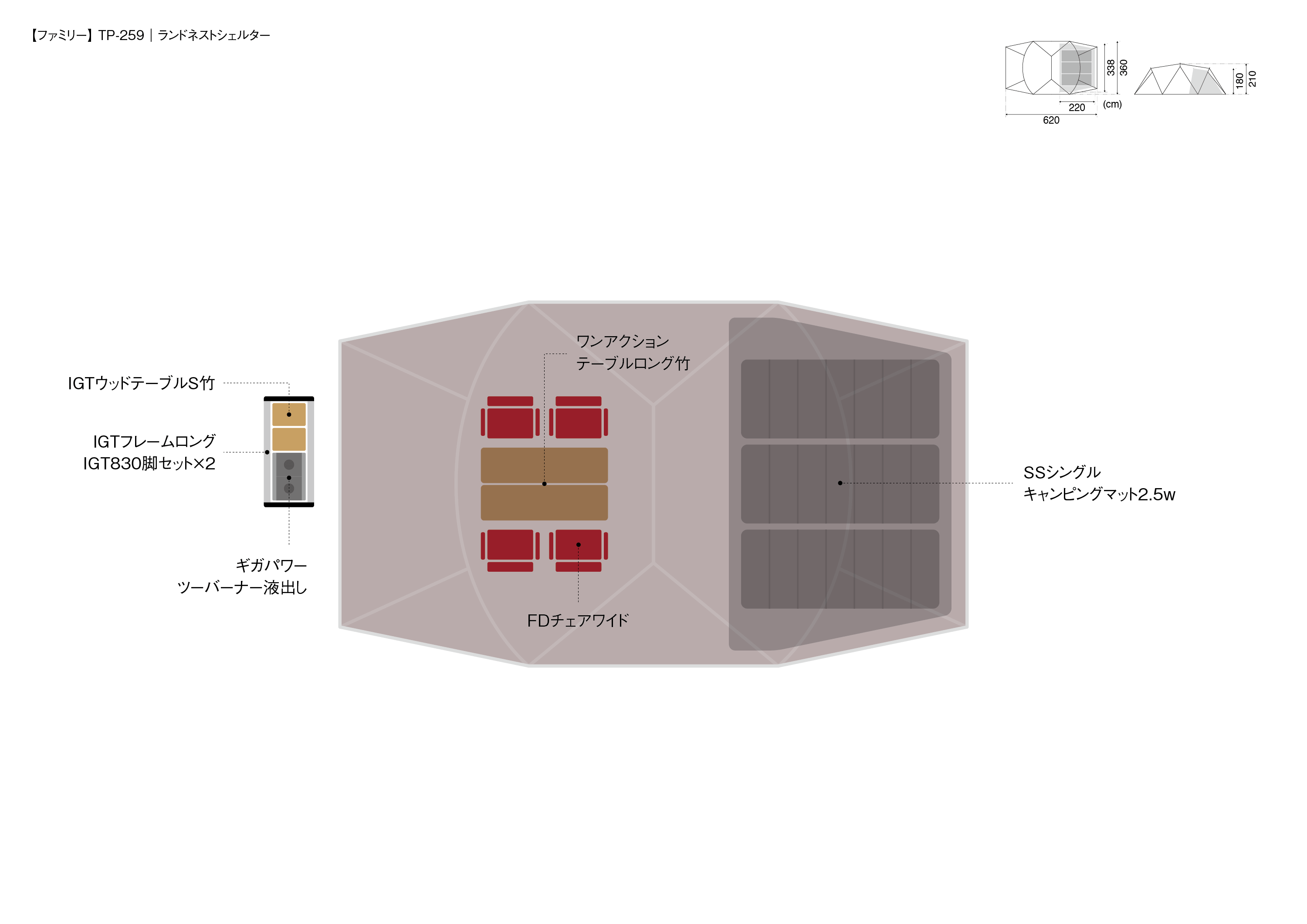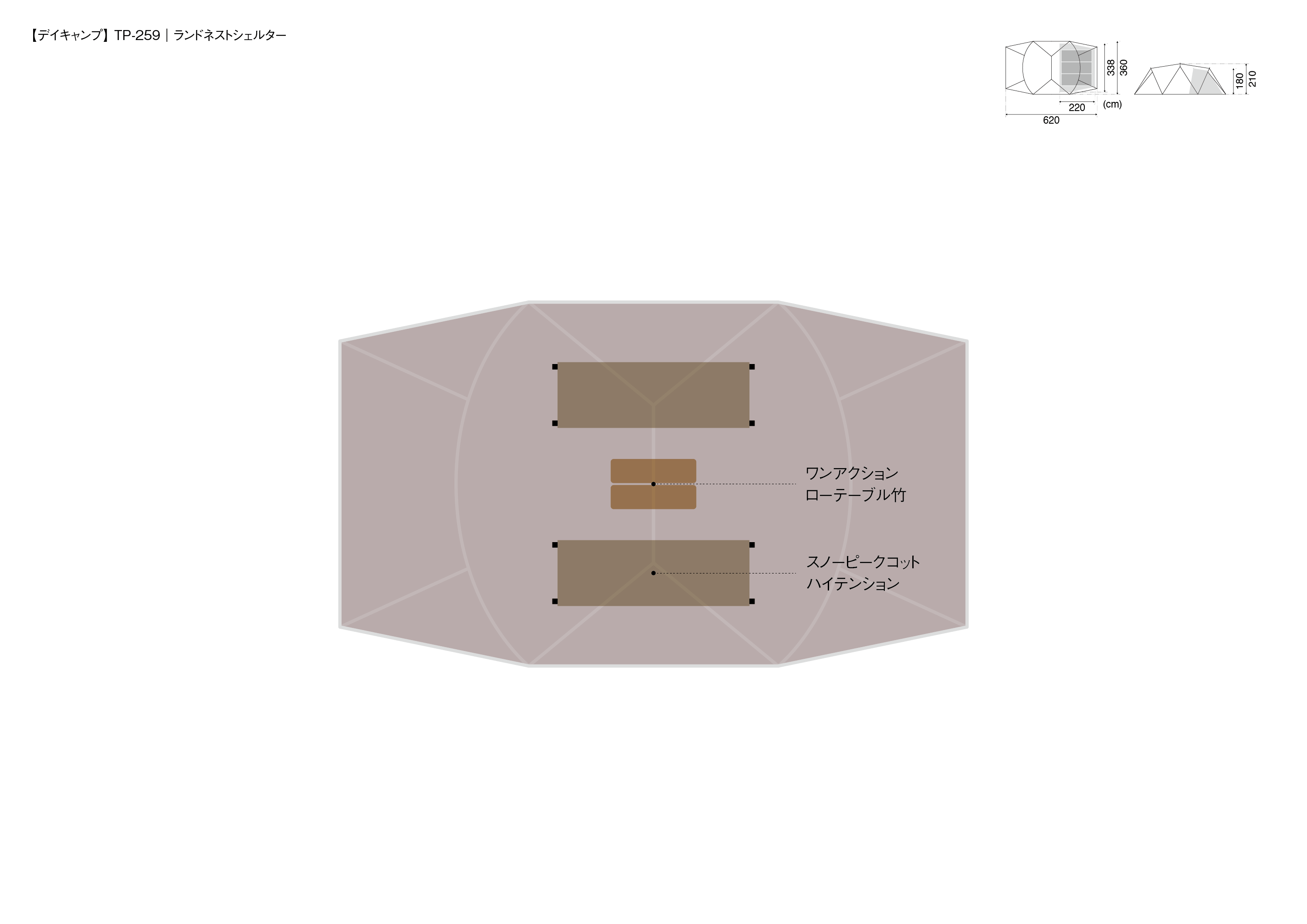 材質 | 本体(ルーフ部)/75Dポリエステルタフタ・遮光ピグメントPUコーティング耐水圧1,800mmミニマム・撥水加工・UVカット加工、本体(ウォール部)/75Dポリエステルタフタ・PUコーティング耐水圧1,800mmミニマム・撥水加工・UVカット加工、本体(スカート部)/210Dポリエステルオックス・PUコーティング耐水圧450mmミニマム・撥水加工 、インナーウォール/68Dポリエステルタフタ、ボトム/210Dポリエステルオックス・PUコーティング耐水圧1,800mmミニマム、フレーム/A6061(φ17.5mm、φ16mm) |