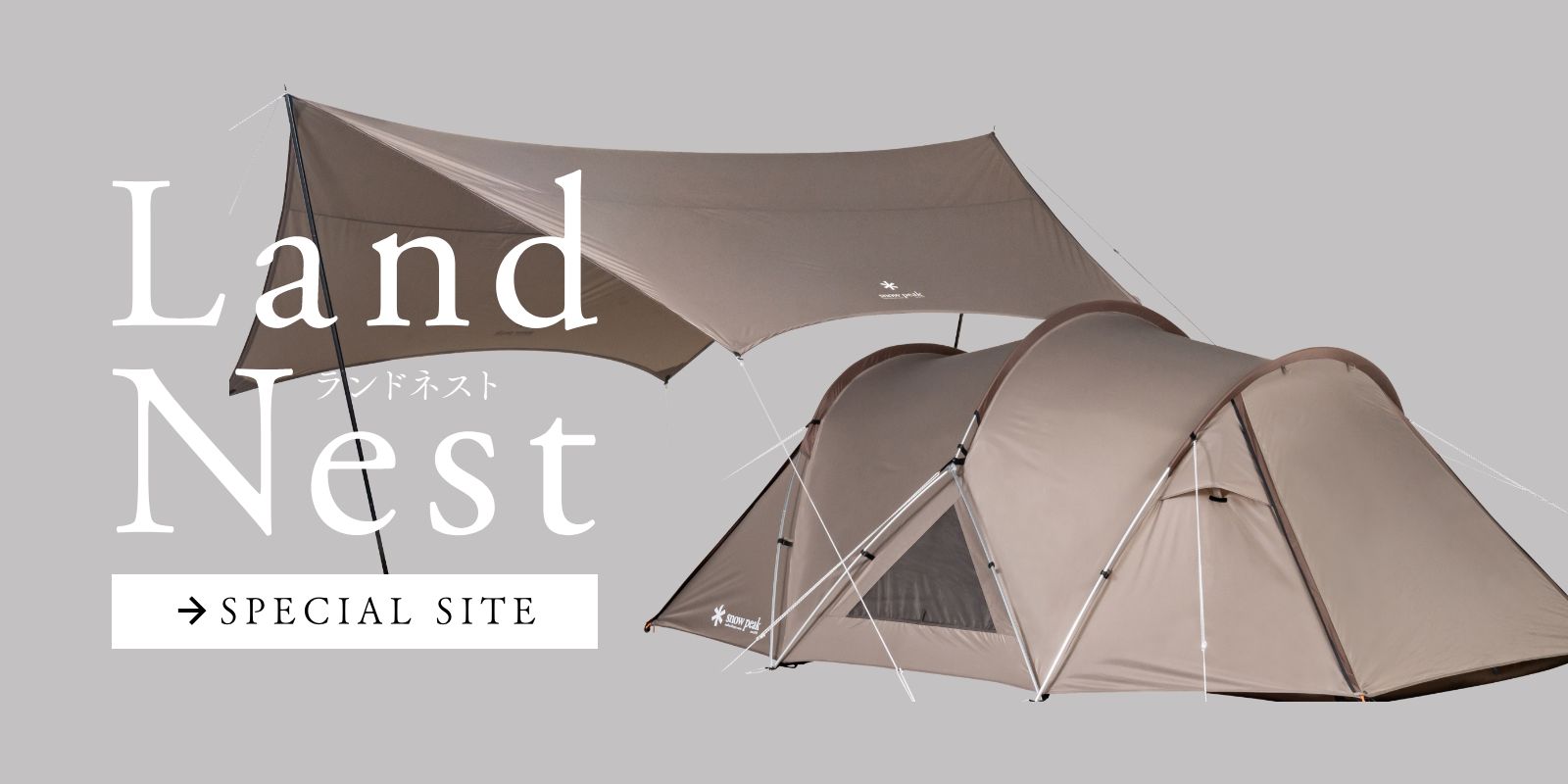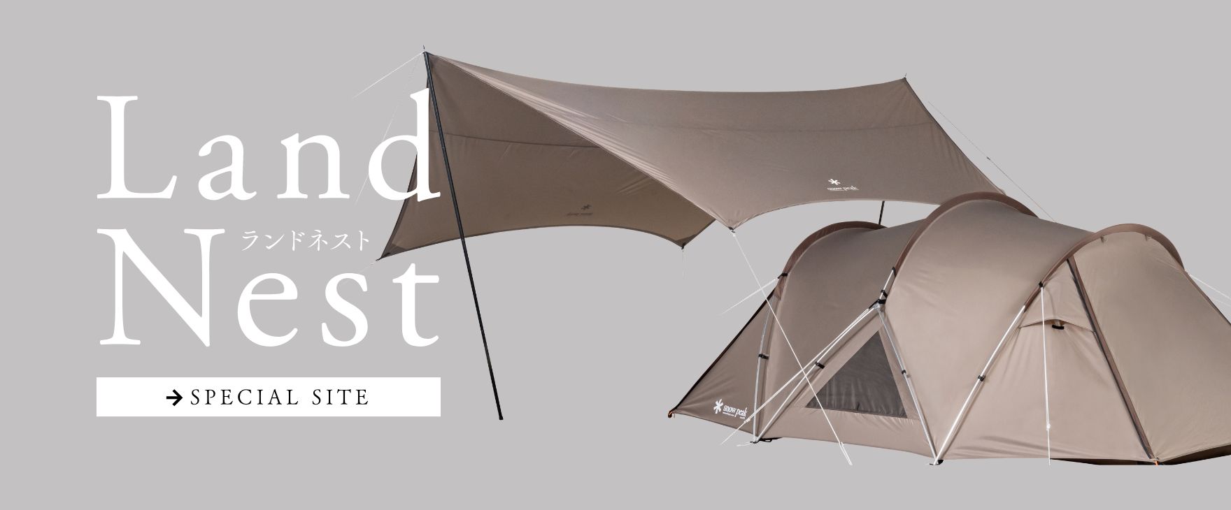開発者自身が初心者目線に立ち返って必要な機能を洗い出し、誕生した新たなエントリーモデル「ランドネスト」。こだわりの一つは設営のしやすさです。ランドネストドームは、登山とオートキャンプの知見を融合させたハイブリッド型の構造で、登山用テントで多く用いられる逆Y字型フレームをメインに採用。素早く自立させられるので、組み立てやすくスムーズな設営が可能です。さらにオートキャンプ用テントで馴染みのあるC型のフレームを用いて、空間を拡張、快適な居住性を確保しました。そして、フライシートに前後の区別をもたせていないのも、開発者のこだわり。吊り下げ式のインナーテントは前と後ろ、どちらの位置にも付けられます。さらに三角パネル部分には、フライシートとインナーテントの両方にメッシュパネルを配置。インナーテントは前後左右にメッシュがあることで風の通りが非常に良く、快適性が向上しています。またランドネストタープは、ランドネストドームの形状に合わせて、有効面積を最大限広く確保。さまざまな天候に対応するリビング空間を創出します。それぞれが直角に交わるレイアウトを基本とすることで、導線のムダが省け、区画サイトで一般的な10m×10mの空間に余裕をもって収まるのもポイントです。色は濃淡の異なるグレーを組み合わせました。新鮮でありつつもスノーピークの世界観を感じられ、自然になじむ新しいカラーリングとなっています。