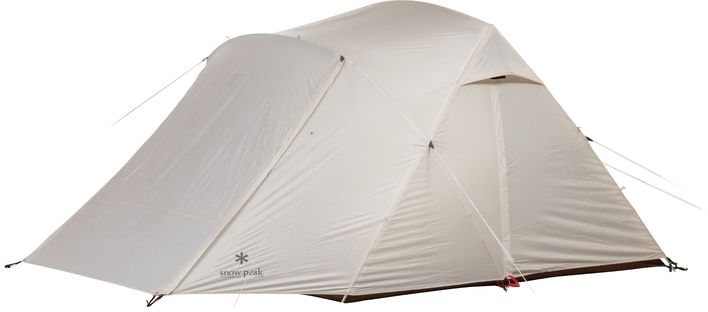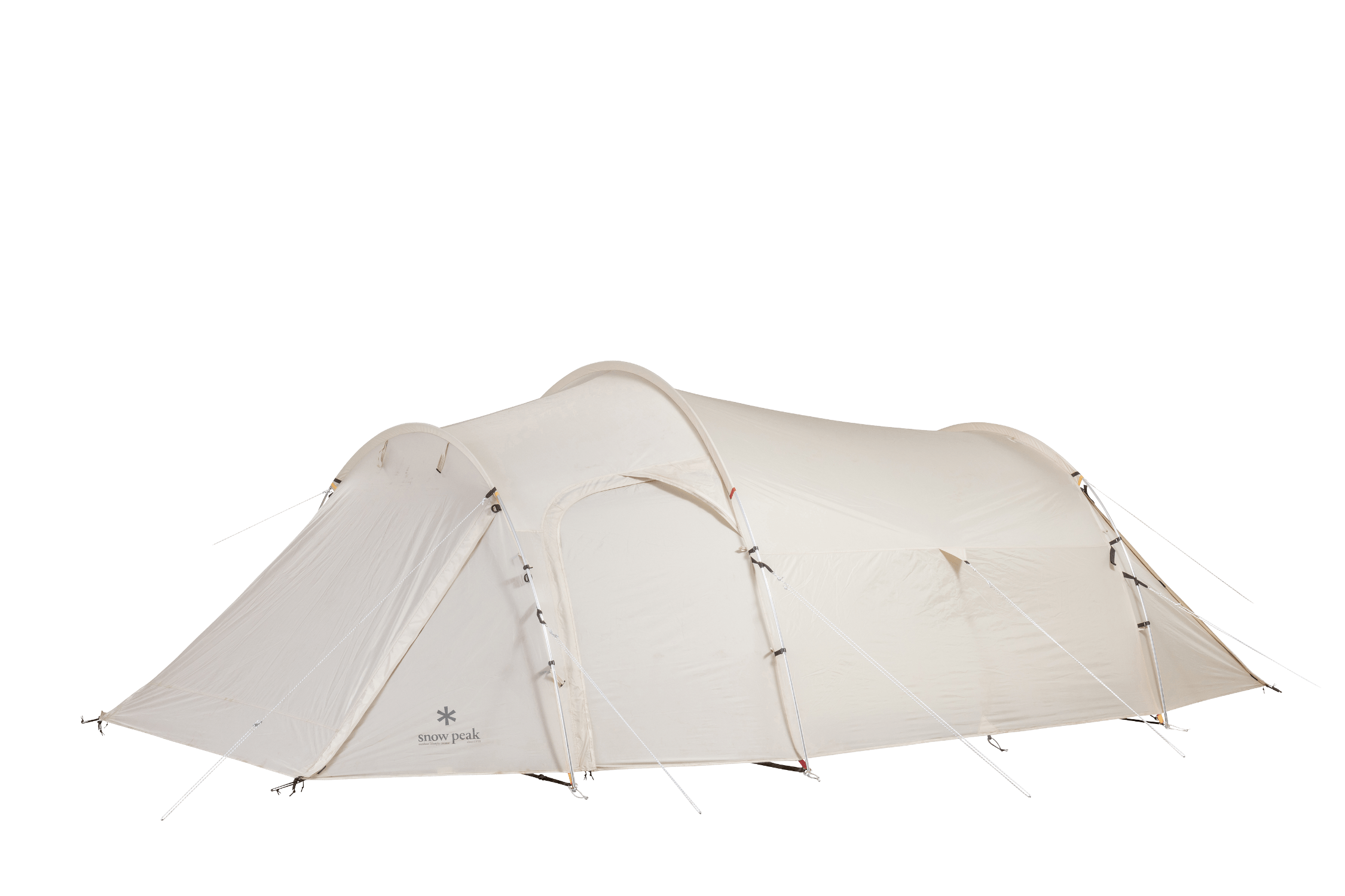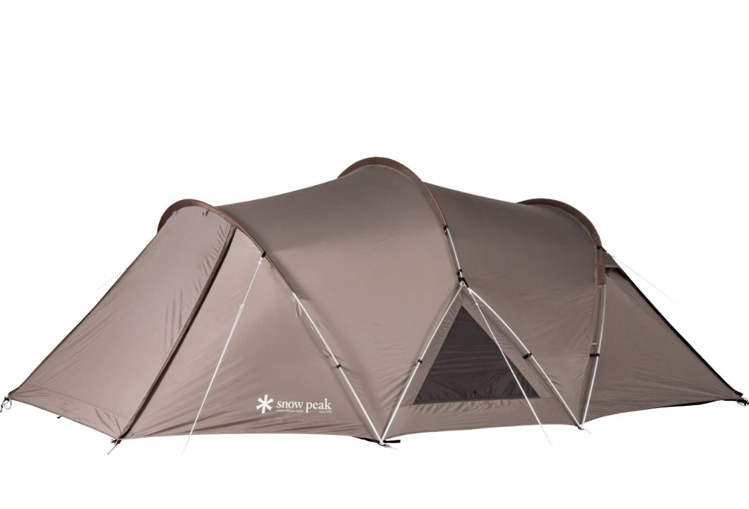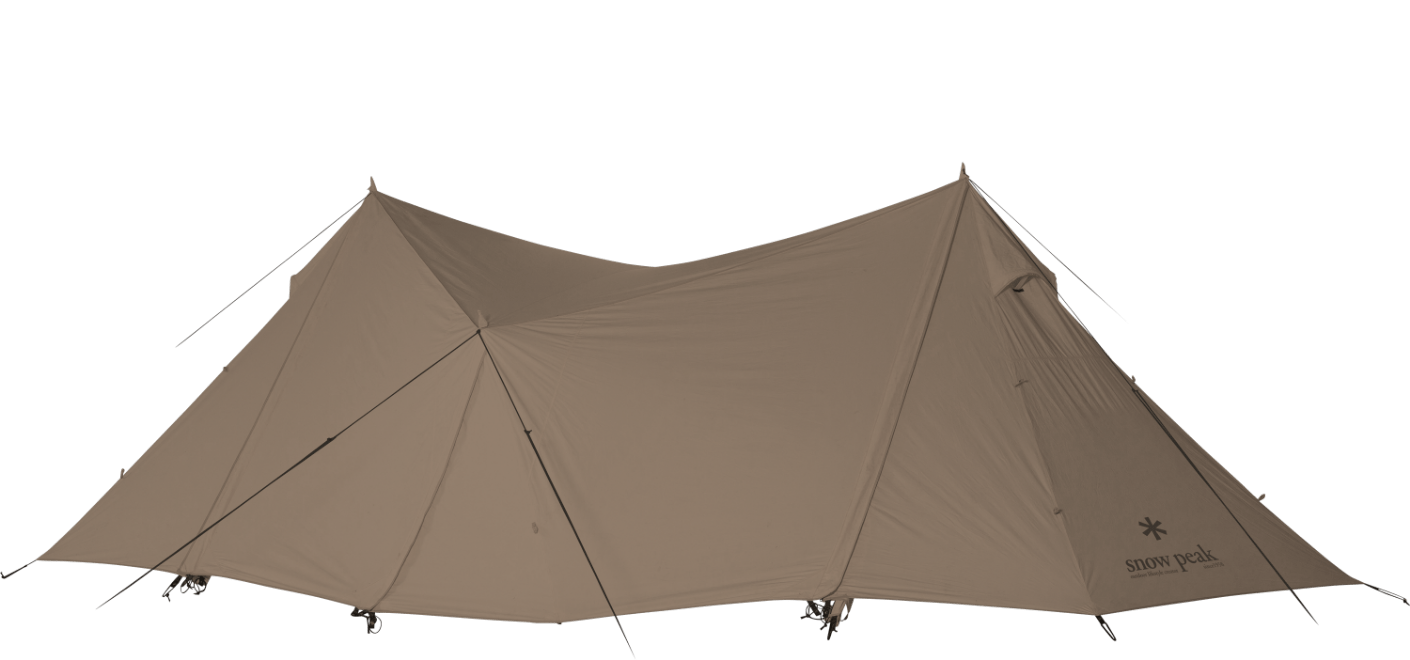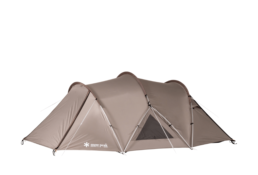 2~4 人での使用を想定して生み出された新たな2ルームシェルター「トゥーガ」。その開発に着手するきっかけとなったのは、「軽量化」と「少人数で快適に使える、ちょうどいい広さ」を求めるユーザーの声でした。まずは前後のフレーム構造を見直し、前方にはバイザーフレームを用いることでフレームの全体量を減らし、軽量化を実現。さらに両サイドのフレームの立ち上がりの角度や、前後のフレームの高さを調整して、快適な居住性を追求し、室内空間の有効面積の広さを最大化させています。また天井の高さやメッシュパネル、スカートは、スノーピークで不動の人気を誇る大型の2ルームシェルター「ランドロック」を踏襲。スカートがシェルター全体に付いているので、冬は外気の侵入を軽減して暖かく過ごすことができます。生地は比較的軽く、十分な強度を備えている75デニールのポリエステルタフタを採用。夏の暑さ対策として遮光ピグメントPU加工を施し、生地を通す光を軽減させることで、体感温度を低くします。インナールームは吊り下げ式で、「キャンピングマット2.5w」を最大4枚まで収容可能。スノーピークが求める快適性、そして強度にこだわりながら、細かなブラッシュアップを繰り返し、新たなシェルターが誕生しました。春夏秋冬、季節を問わず、デュオキャンプや夫婦2人と子ども1~2人でのファミリーキャンプを楽しまれたい方にオススメです。