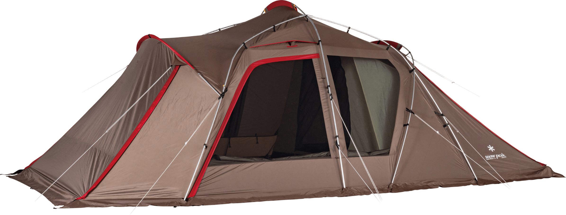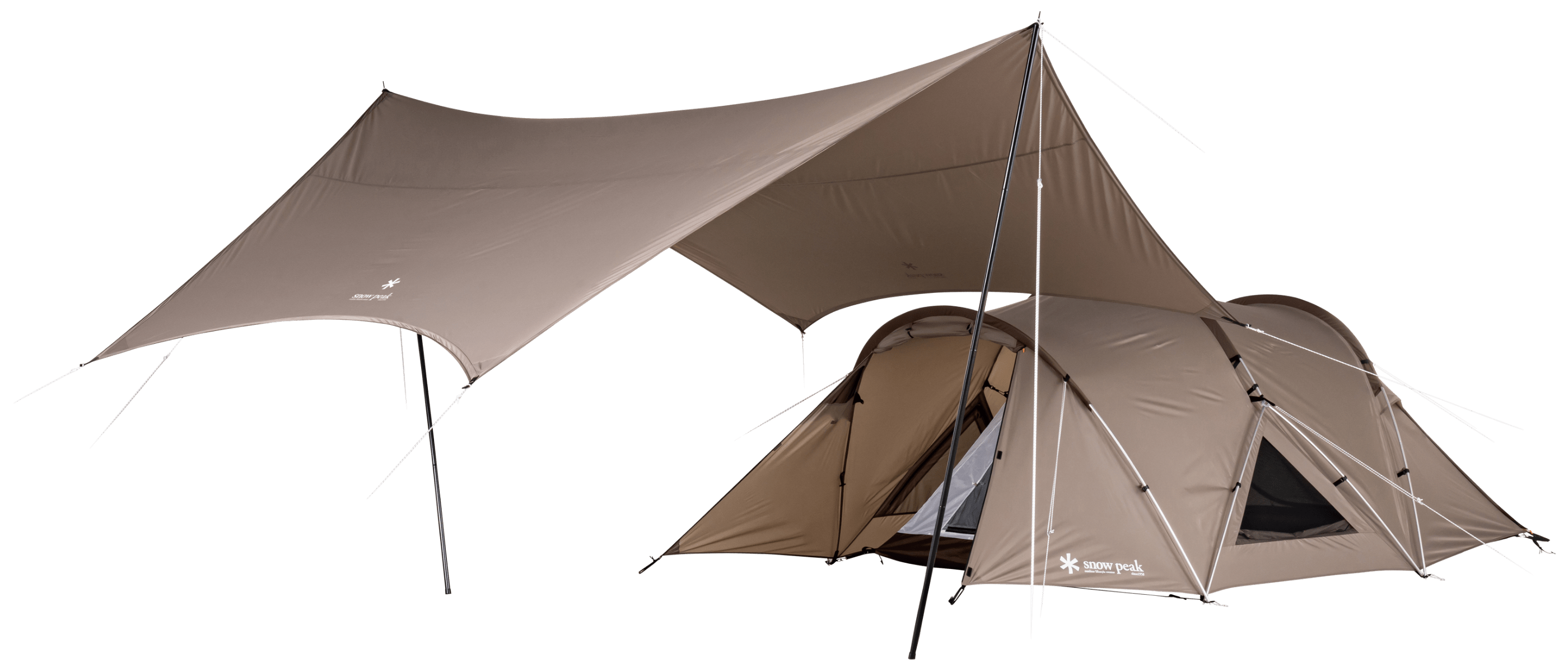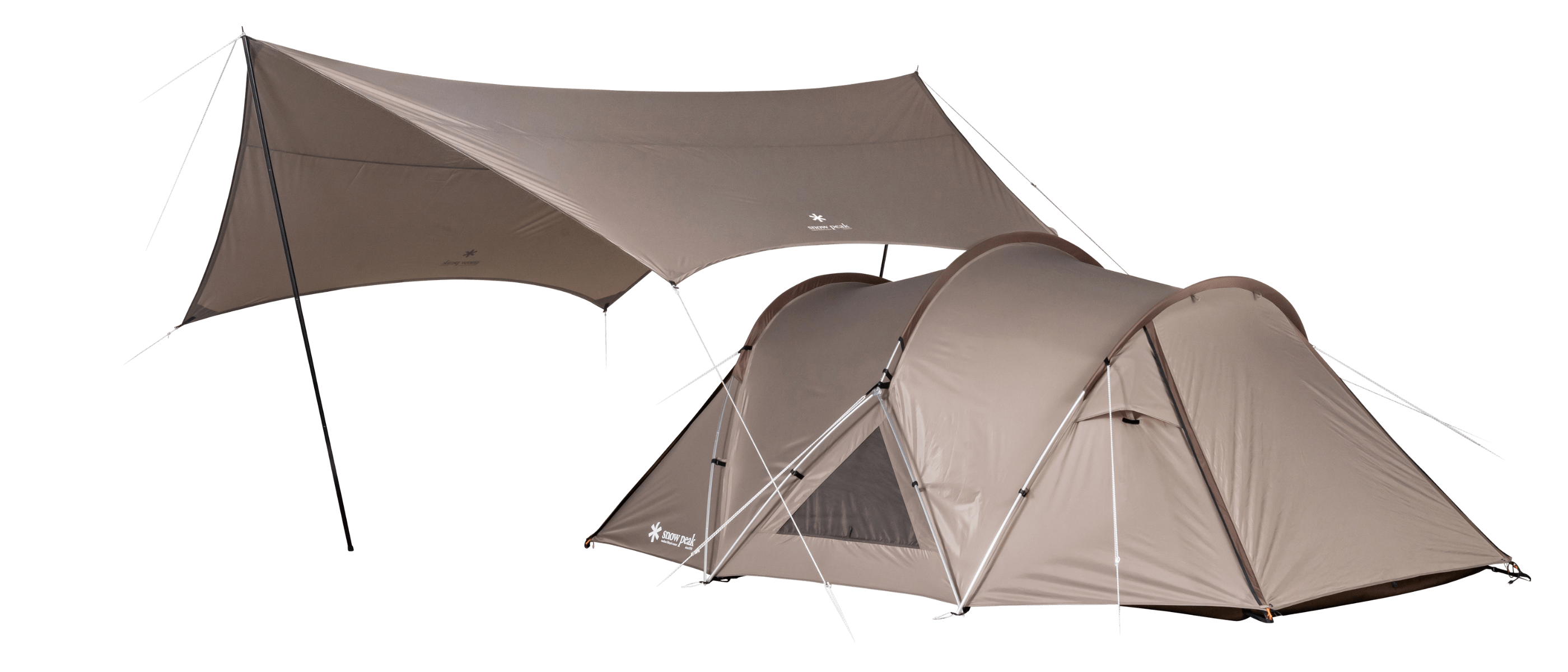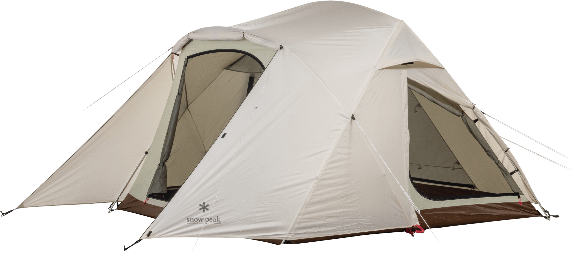 2~4 人での使用を想定して生み出された新たな2ルームシェルター「トゥーガ」。その開発に着手するきっかけとなったのは、「軽量化」と「少人数で快適に使える、ちょうどいい広さ」を求めるユーザーの声でした。まずは前後のフレーム構造を見直し、前方にはバイザーフレームを用いることでフレームの全体量を減らし、軽量化を実現。さらに両サイドのフレームの立ち上がりの角度や、前後のフレームの高さを調整して、快適な居住性を追求し、室内空間の有効面積の広さを最大化させています。また天井の高さやメッシュパネル、スカートは、スノーピークで不動の人気を誇る大型の2ルームシェルター「ランドロック」を踏襲。スカートがシェルター全体に付いているので、冬は外気の侵入を軽減して暖かく過ごすことができます。生地は比較的軽く、十分な強度を備えている75デニールのポリエステルタフタを採用。夏の暑さ対策として遮光ピグメントPU加工を施し、生地を通す光を軽減させることで、体感温度を低くします。インナールームは吊り下げ式で、「キャンピングマット2.5w」を最大4枚まで収容可能。スノーピークが求める快適性、そして強度にこだわりながら、細かなブラッシュアップを繰り返し、新たなシェルターが誕生しました。春夏秋冬、季節を問わず、デュオキャンプや夫婦2人と子ども1~2人でのファミリーキャンプを楽しまれたい方にオススメです。