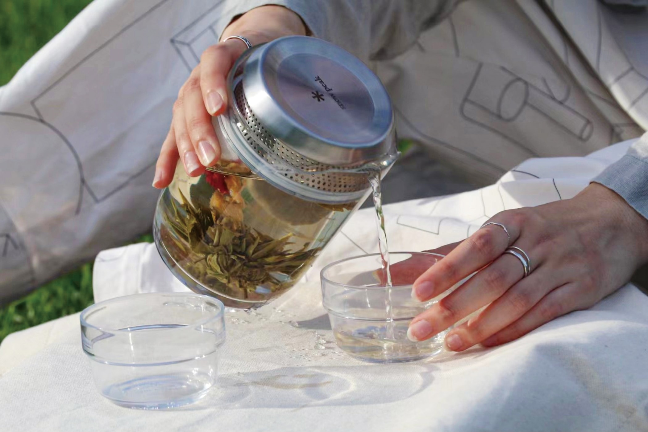 茶葉とお湯があれば手軽に淹れられるお茶の文化を、アウトドアに取り入れたいという想いから誕生しました。ポットは透明度が高く、“サヨウ(茶踊)”と名付けた字の如く、お湯を注ぐと、色の変化や茶葉が上下に踊るように動く様子を楽しめます。ステンレスボトルなどと一緒に持ち運べる風呂敷タイプの収納ケース付き。