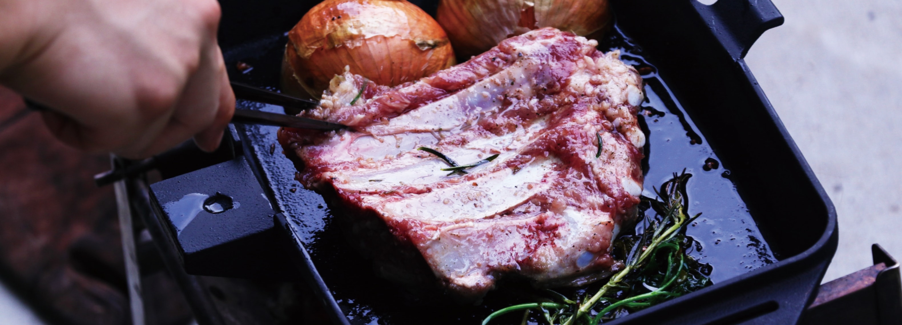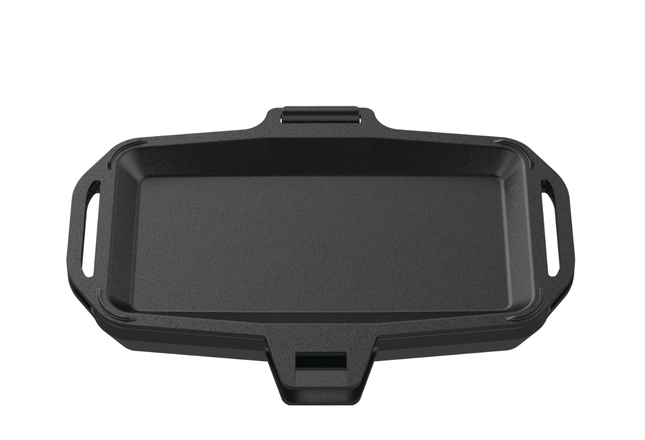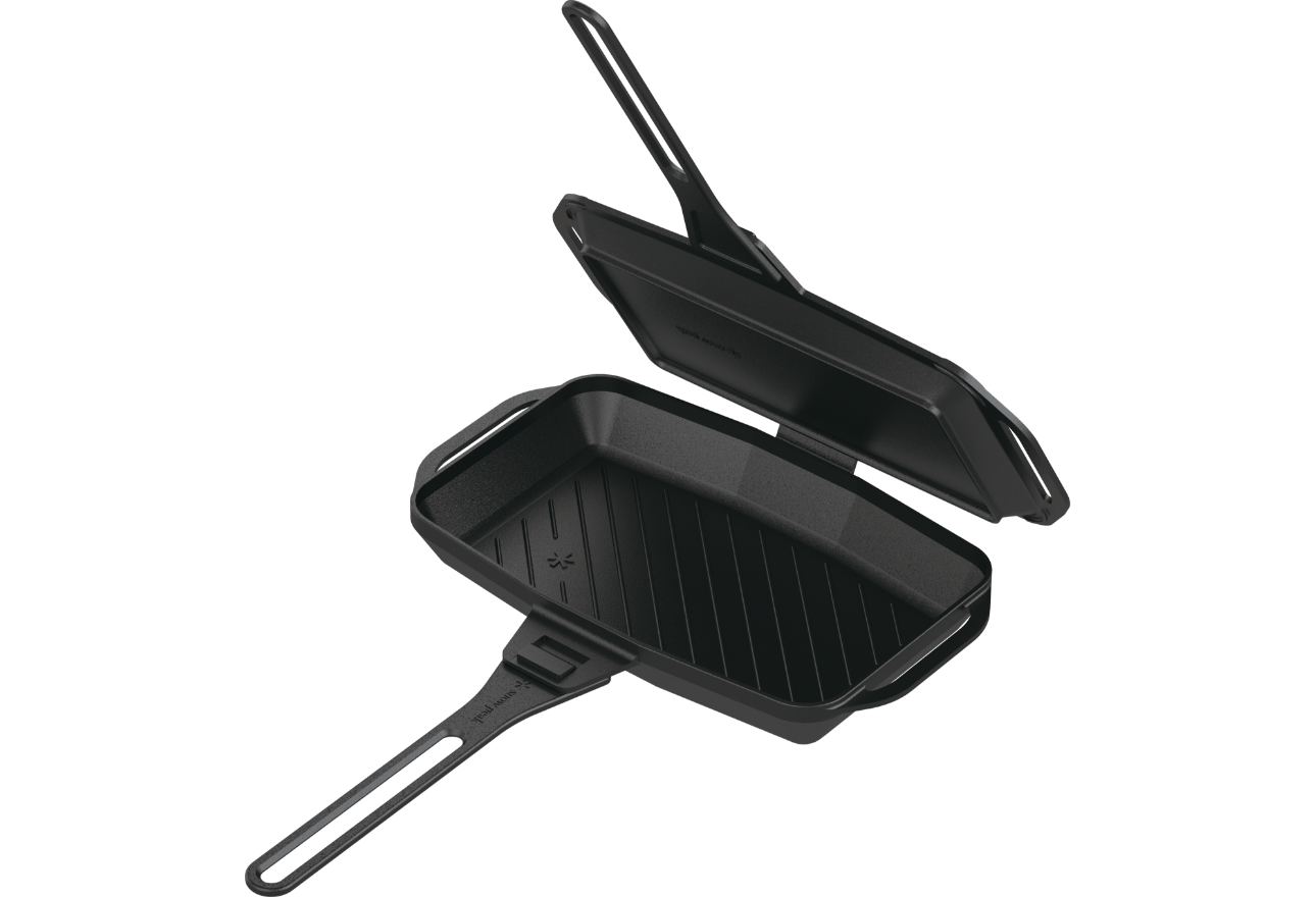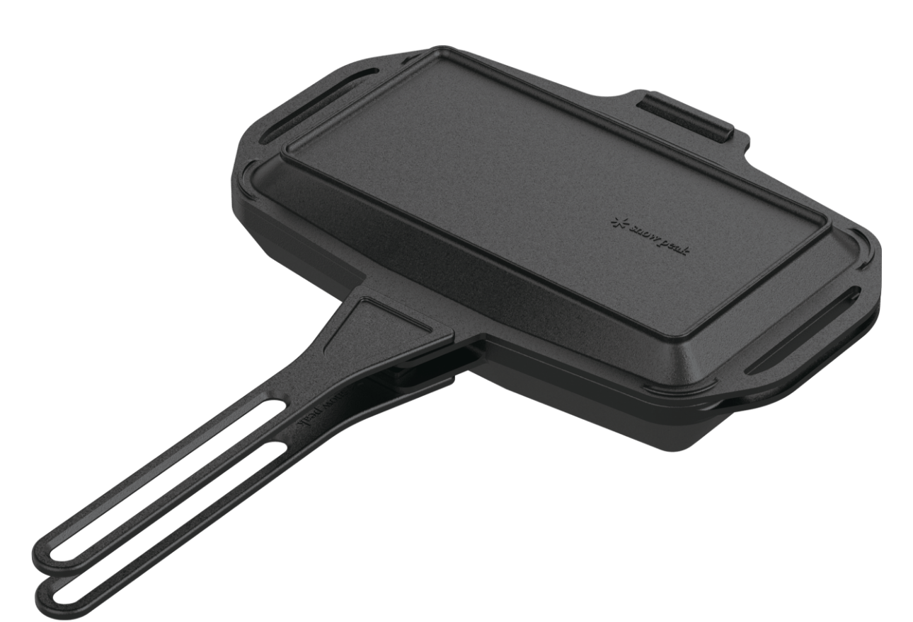 鯛などの魚も丸ごと入る長方形の鋳鉄製スキレット。焚火や炭火で豪快に調理を楽しめます。深さのあるスキレットで分厚いステーキやパエリアを作ったり、食パンを2枚並べてホットサンドを焼くことも可能。焼く、煮る、蒸すの“1台3役”を担う調理方法の幅広さが魅力です。