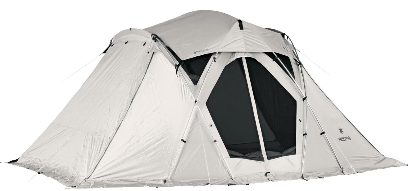 Snow Peak USAのスタッフやユーザーの声から生まれた、USオリジナルモデル。体格の大きな人も快適に過ごせるよう設計された、186cmの天井高と出入りのしやすい大きなフロントが特長です。付属しているアップライトポールで前室パネルを跳ね上げることで、日差しや雨を避けられる開放的なリビングができあがります。前後左右にメッシュパネルを備え、風の通りがよく、オールシーズンで快適に使用できます。
